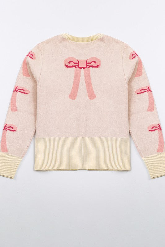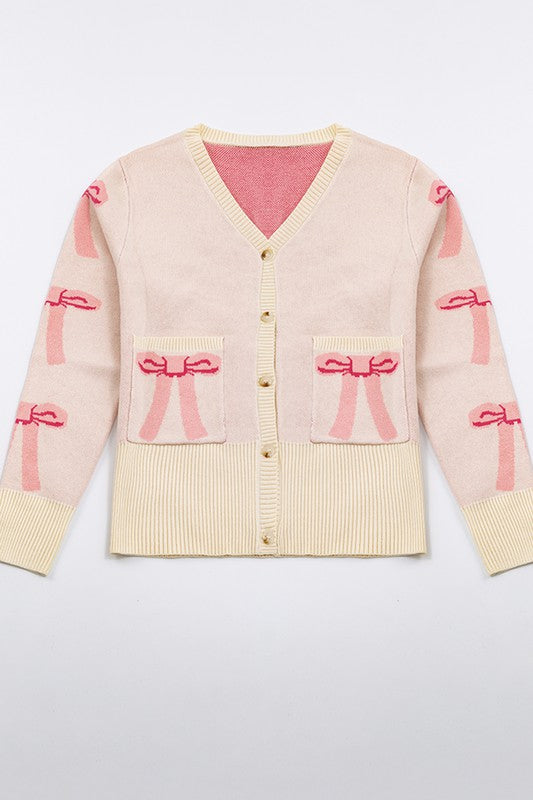 *Exclusive In-House Design*-Bow intarsia on front, back and sleeves-Two front patch pockets-V neckline-Button front closure-All original design